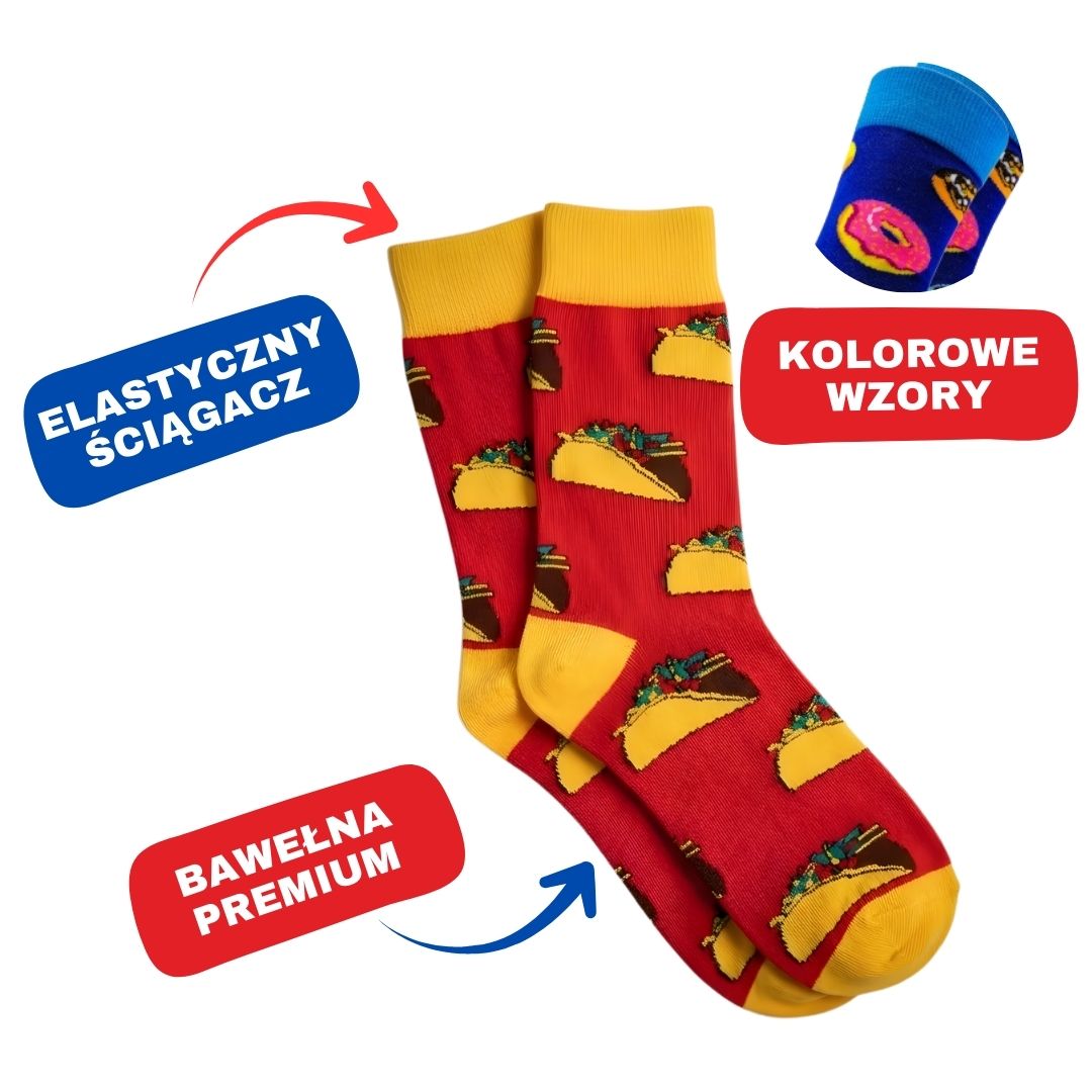 10 par Kolorowych Skarpet w losowych, niepowtarzalnych wzorach. Pizza, rekiny, pies w okularach – nie zdradzimy Ci, co dokładnie znajdziesz. Ale obiecujemy jedno: żadnej nudy, żadnych powtórek, same dobre poranki.
