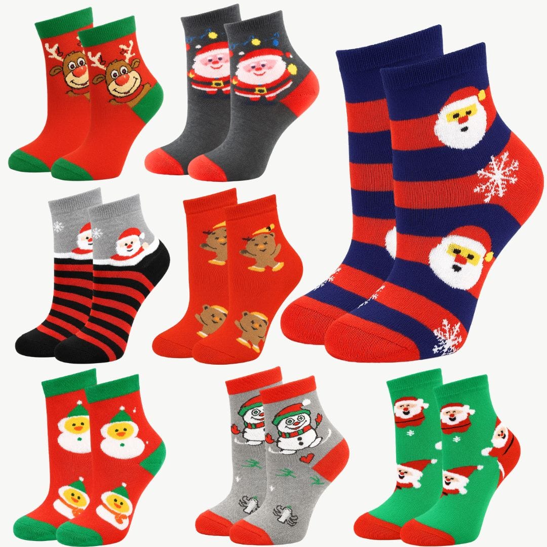 Nie ma losowych wzorów – dokładnie te skarpetki znajdziesz w zestawie: Mikołaje 🎅, renifery 🦌, pierniczki 🍪, bałwanki ☃️ i mnóstwo świątecznych kolorów 🎁